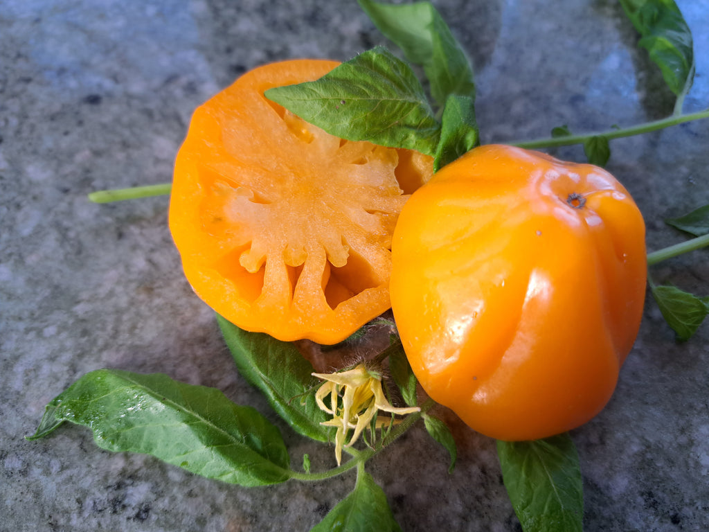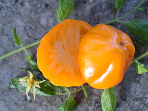 Beutelförmige Fleischtomate, fruchtig aromatisch mit wenig Säure, viel Fruchtfleisch, kaum Samen