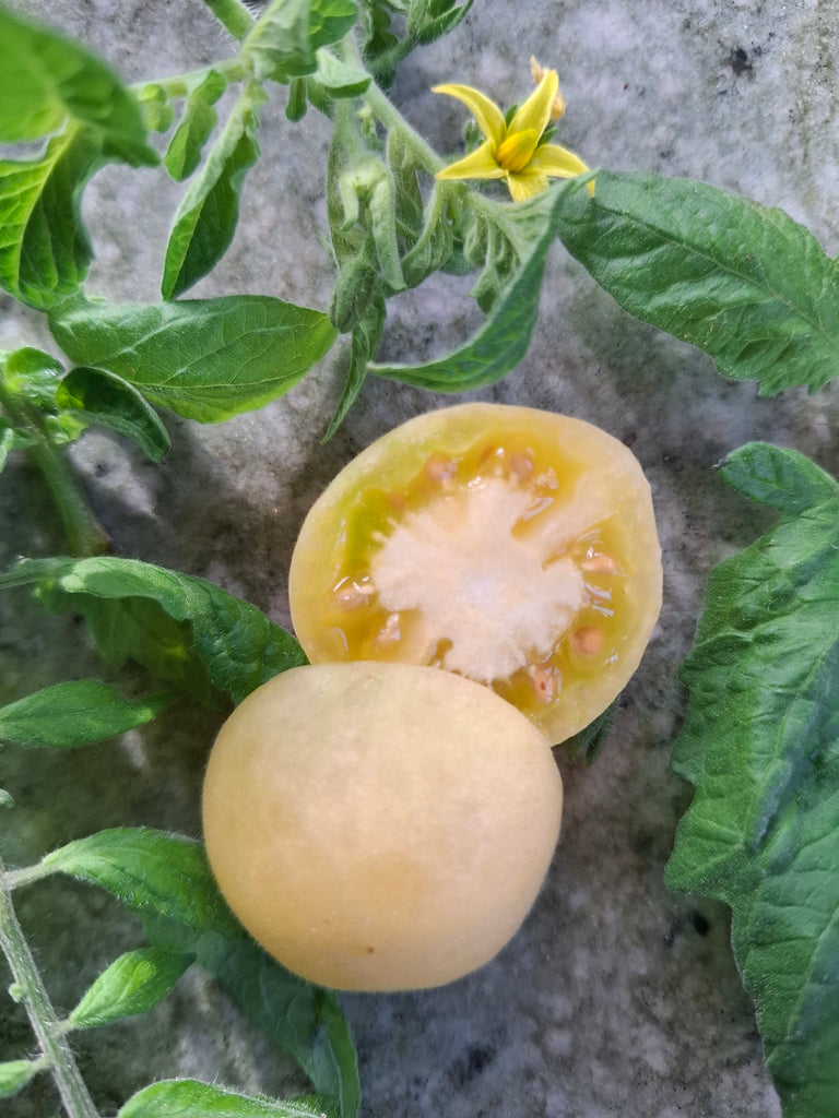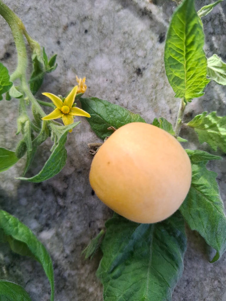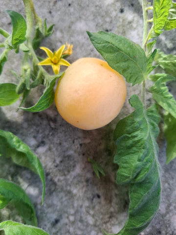 Fruchtig süße, cremefarbene, kleine Salattomate mit leicht flauschiger Schale wie ein Pfirsich