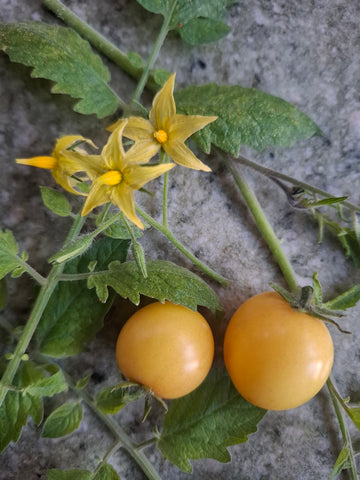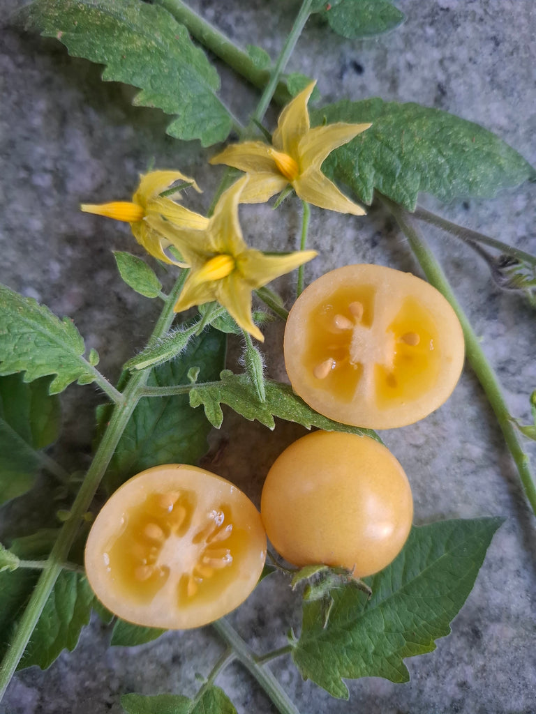 Hellgelbe größere Cherrytomate mit kleiner Nase, Mikrodwarf, nicht ausgeizen!