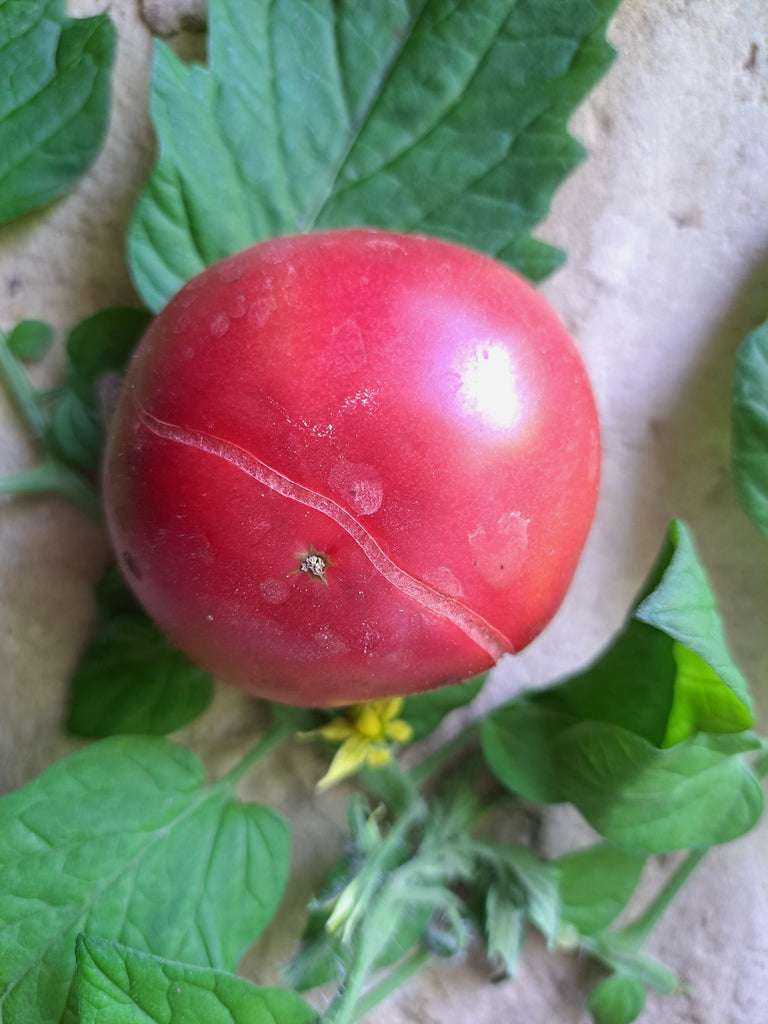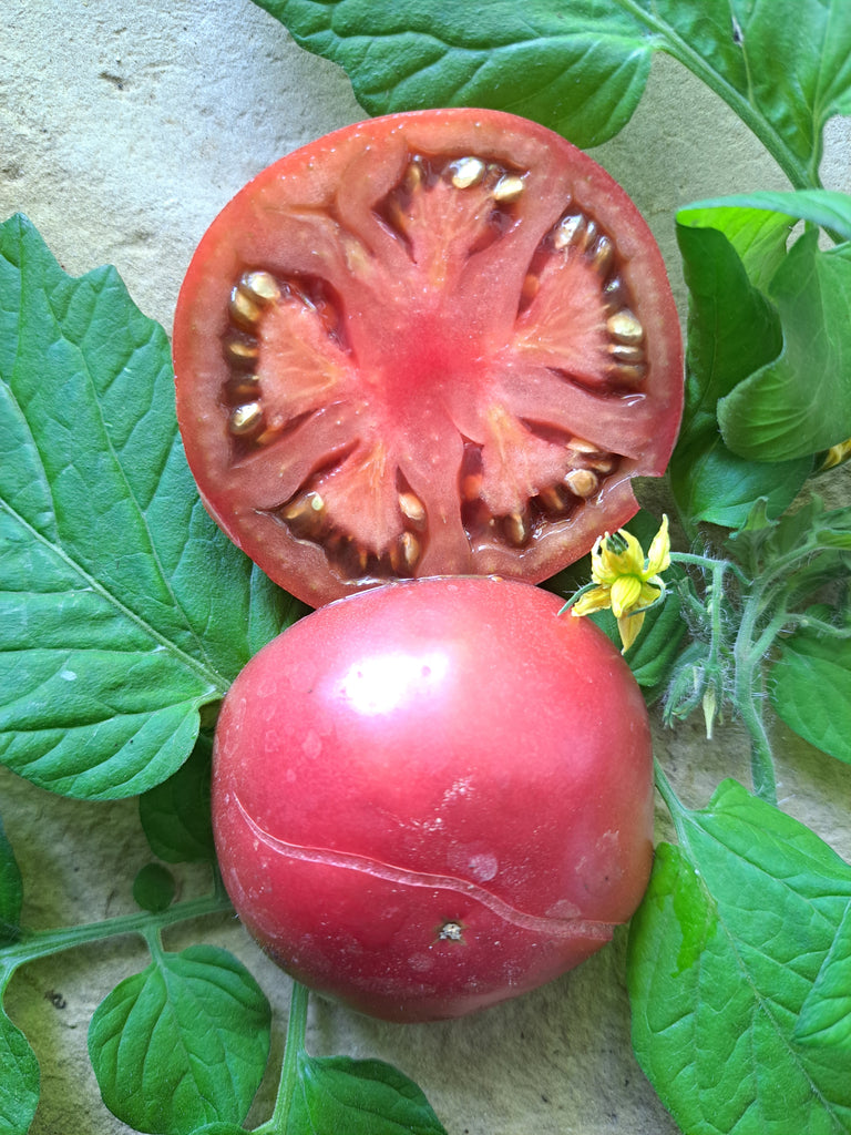 Braunrote bis Purpurrote Ochsenherztomate, sehr aromatisch, wenig Samen