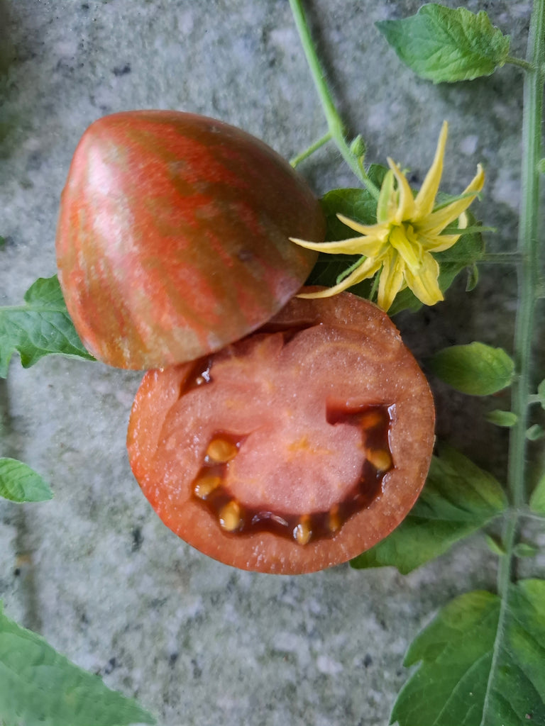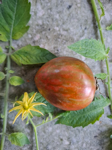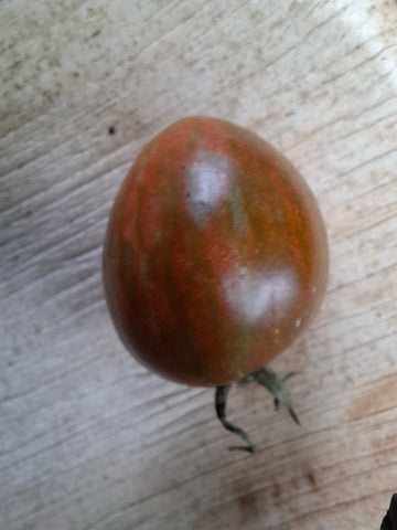 Sehr aromatische vielformige dunkle Fleischtomate mit grünen Streifen