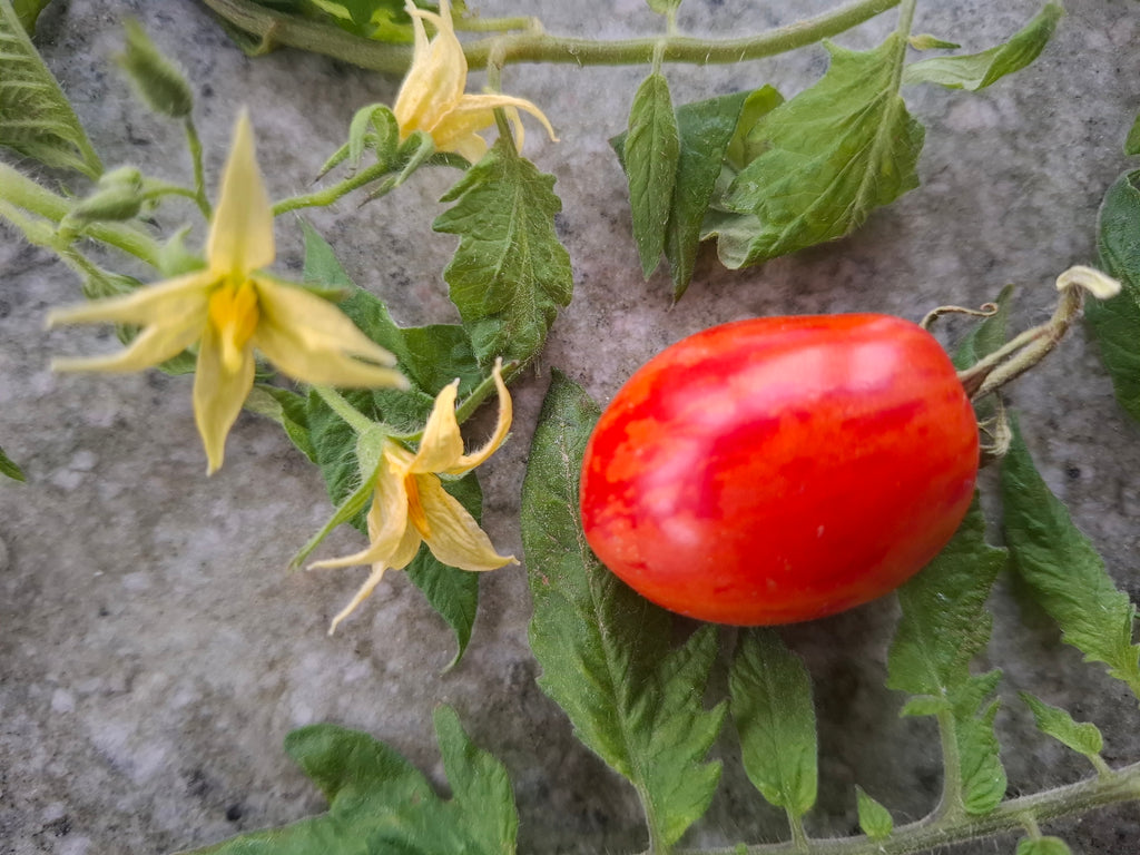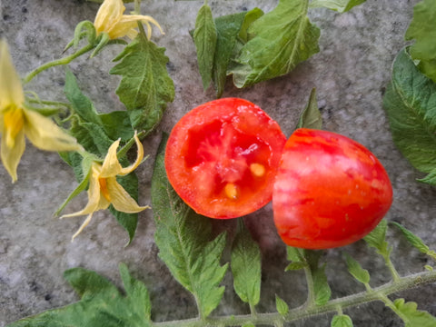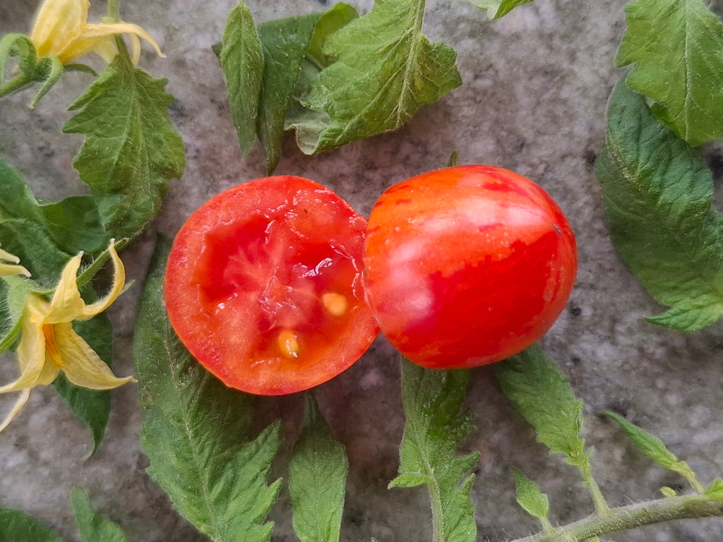 Fruchtig aromatische, kleine, eiförmig, gestreifte Buschtomate. Früchte von etwa 30-50g