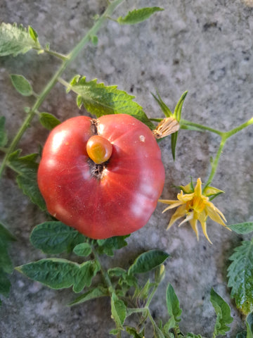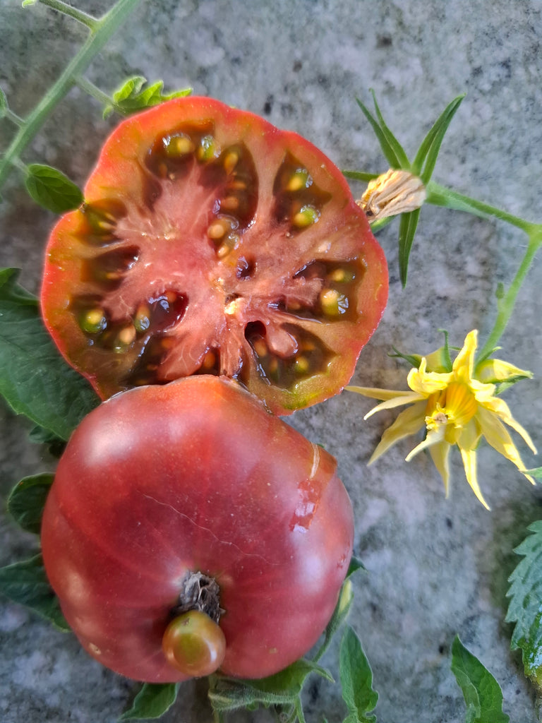 Dunkle, kräftig aromatische, saftige kleine Fleischtomate mit kleinen Samen