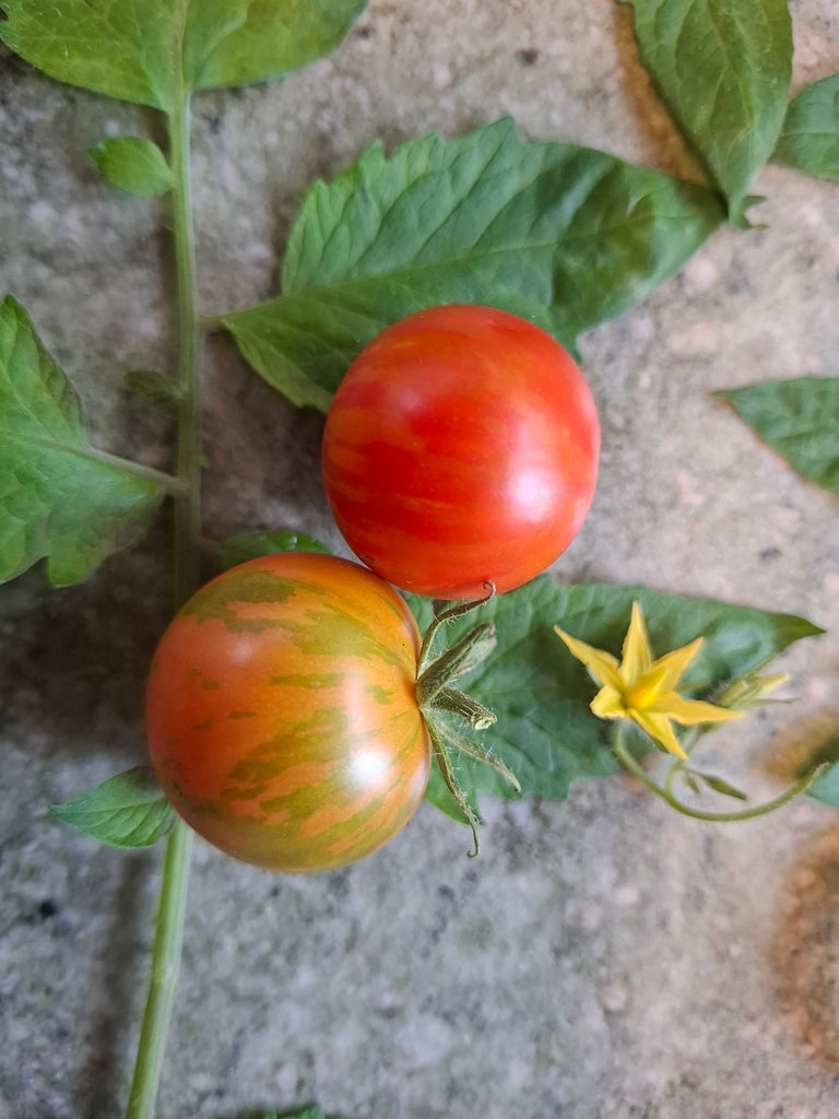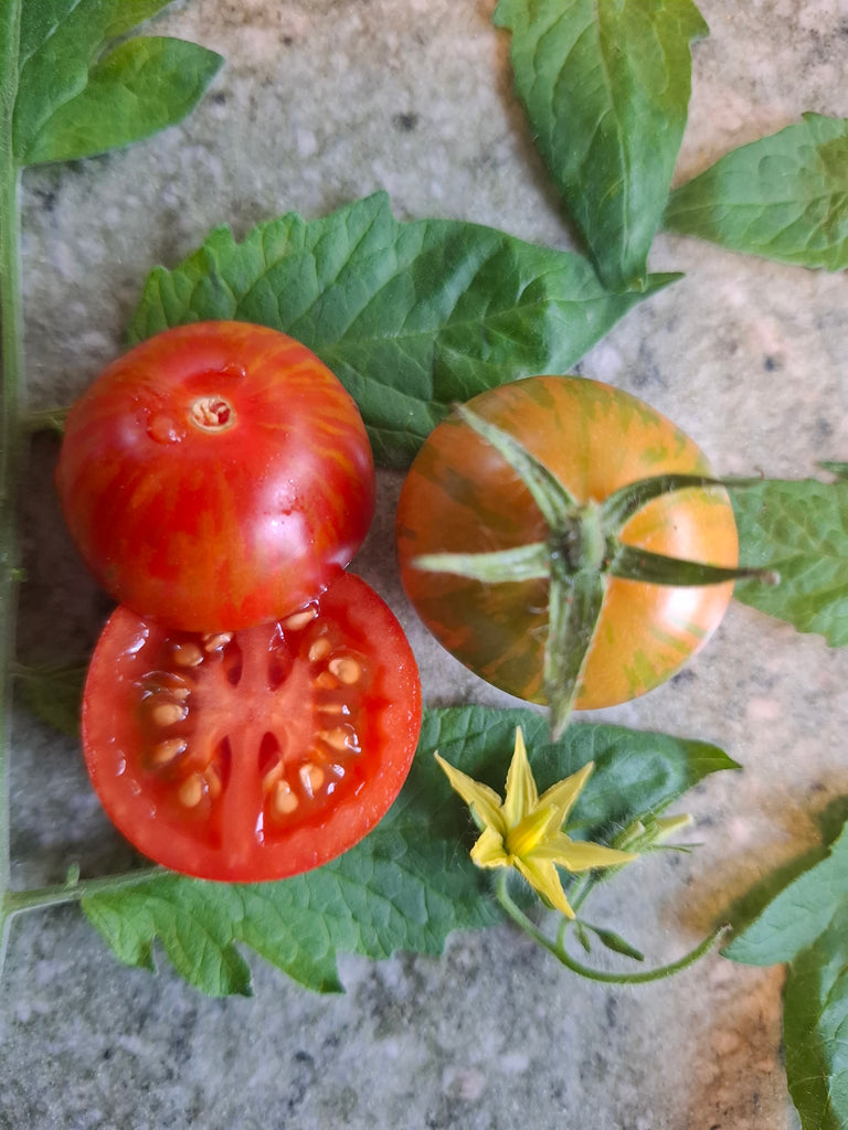 Aromatische kleine rot-orange gestreifte Salattomate, schönes Farbenspiel im Reifeprozess