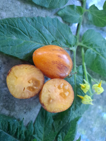 Mikrodwarftomate mit außergewöhnlichen Optik, fruchtig frischer Geschmack bei sehr angenehmer Säure. Extrem wenige Samen! Überraschend hart im Nehmen was schlechtes Wetter betrifft!