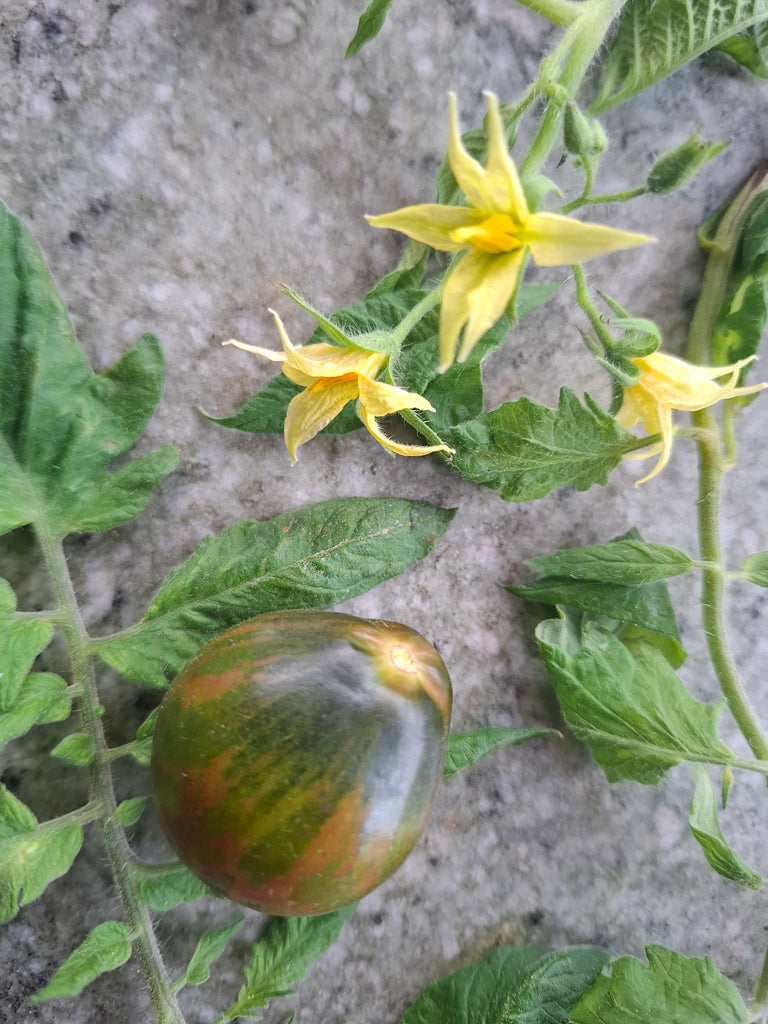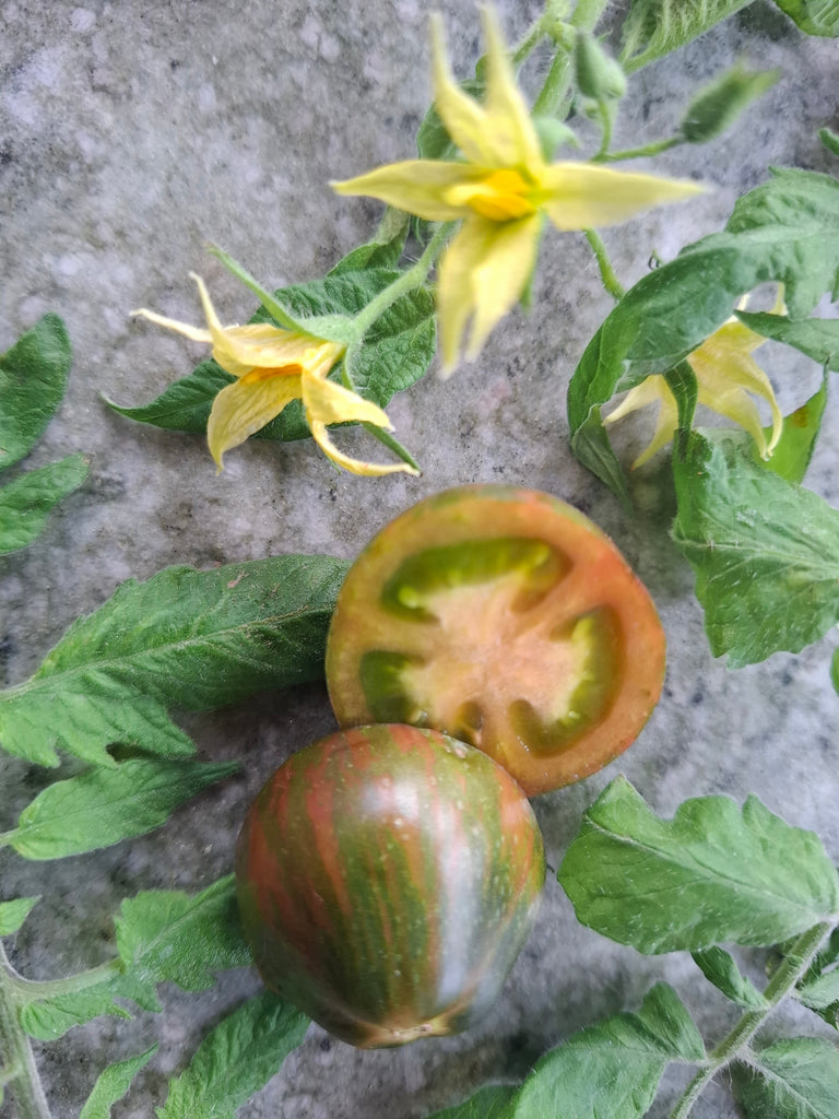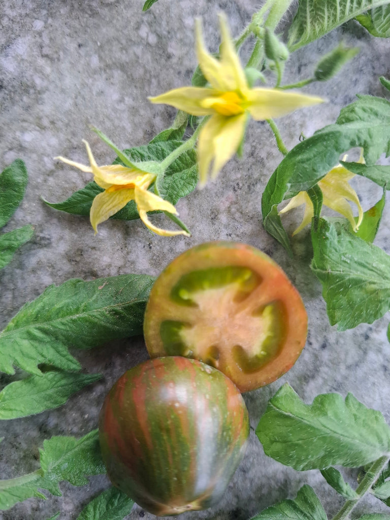 Purpurne, kleine, birnförmige Früchte mit grünen Streifen! Sehr aromatische, saftige Salattomate, Buschtomate: nicht ausgeizen!