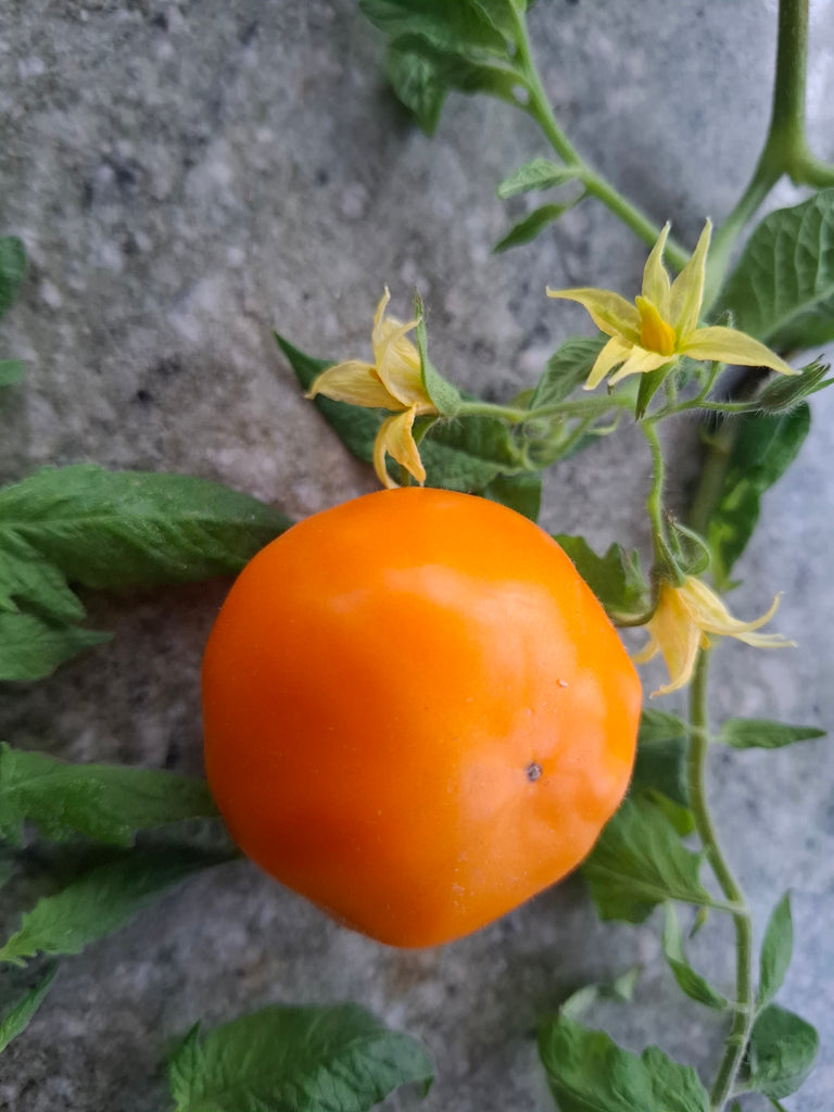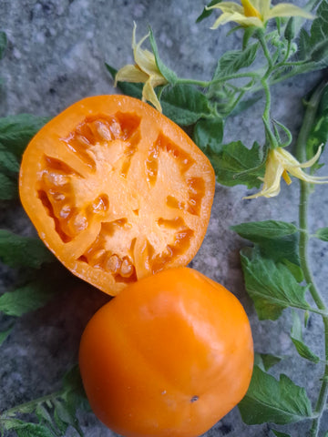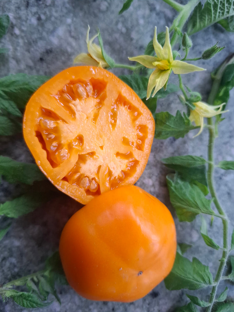 kleine, leuchtend goldorange Fleischtomate mit sehr gutem fruchtigen Geschmack und angenehmer Säure, Wuchshöhe etwa 2m, tolle Neuentdeckung in 2025
