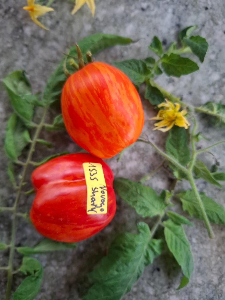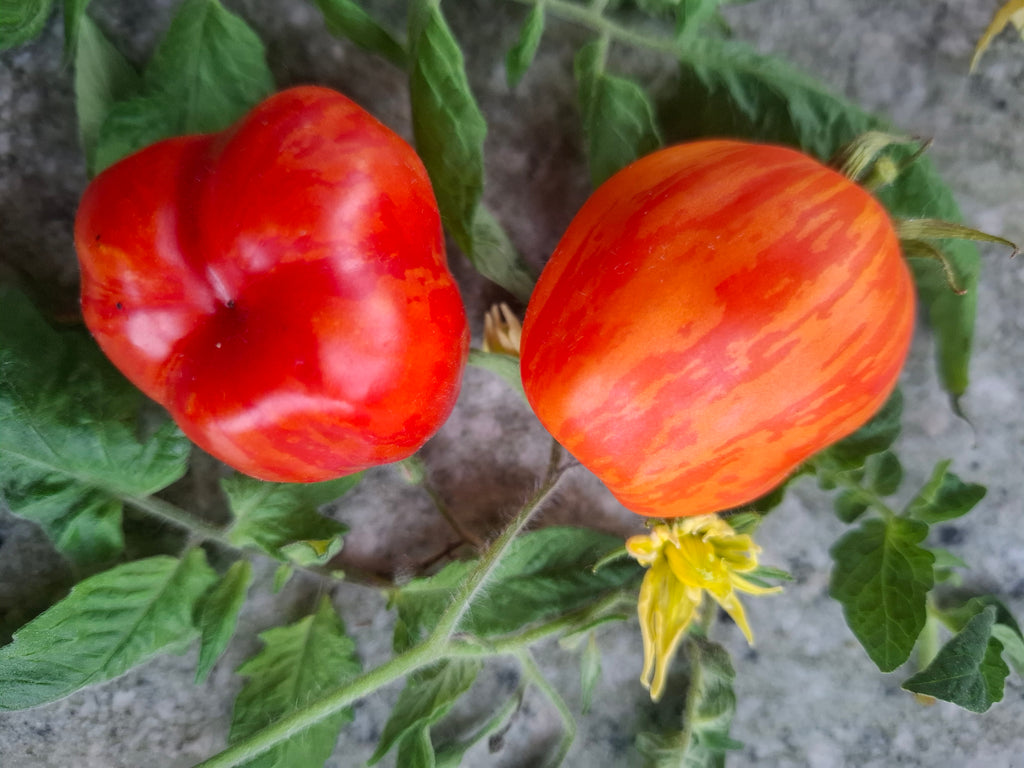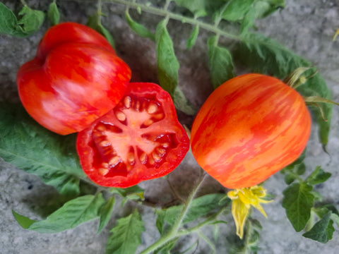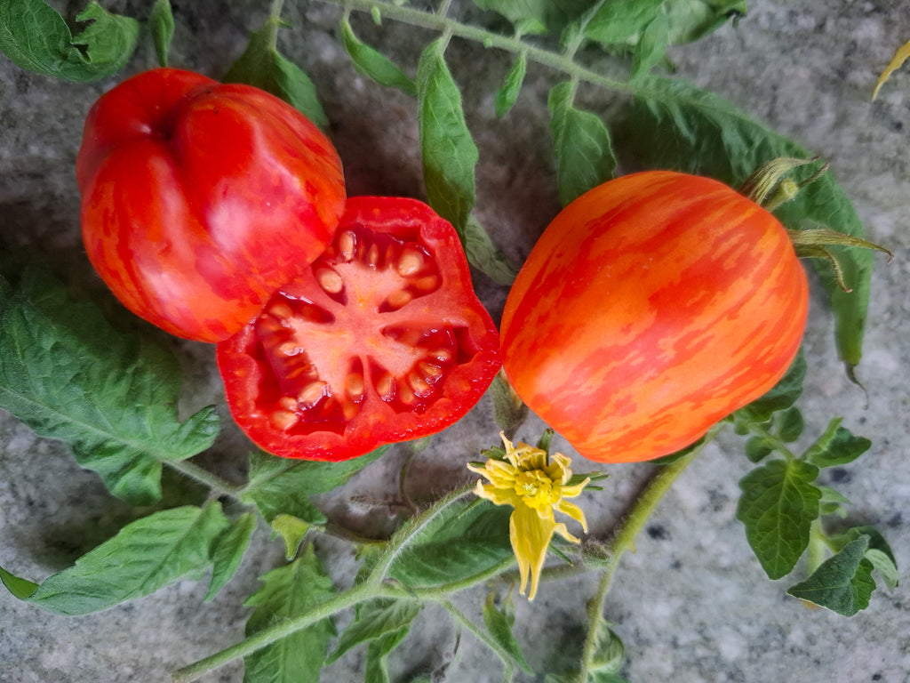 Sehr aromatische, paprikaförmige Tigertomate, gut zu Füllen, jedoch wenig Hohlräume im Inneren