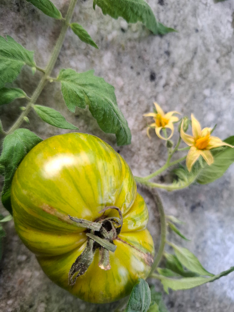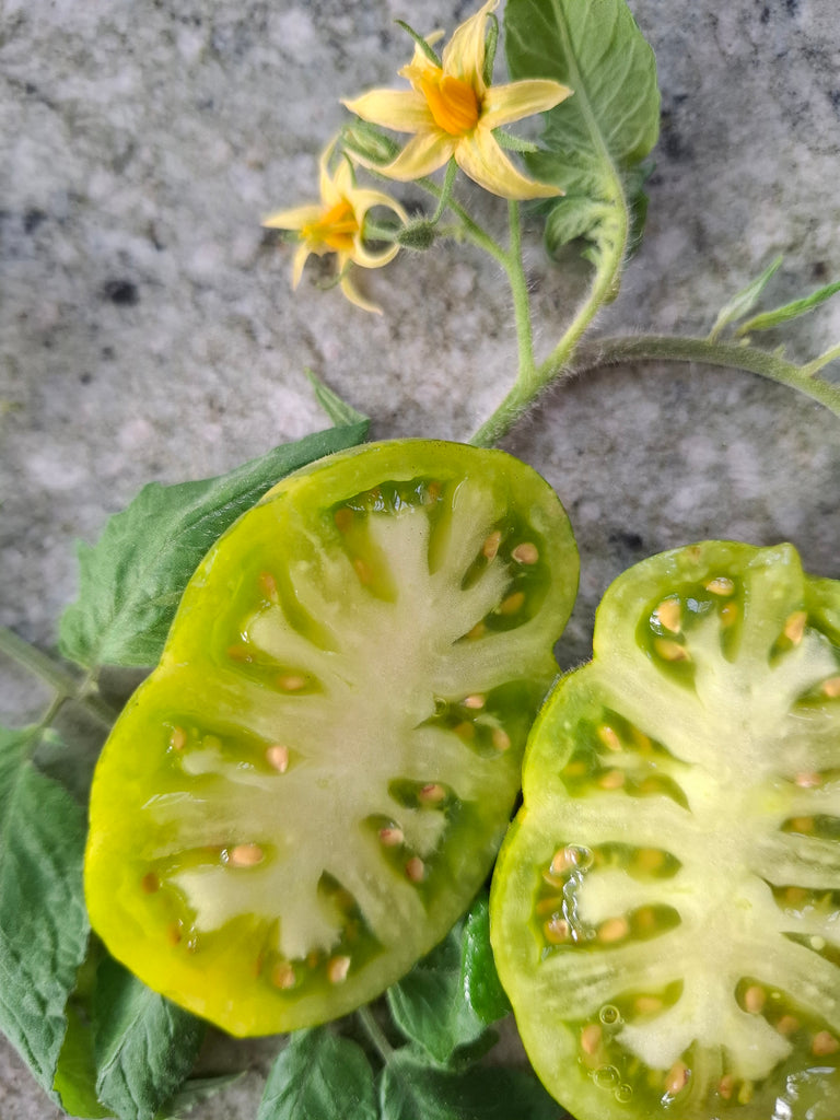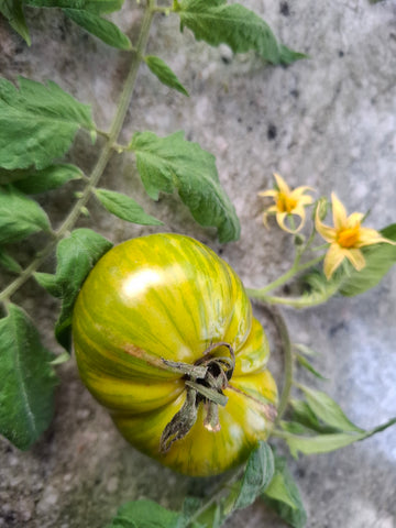 Süße und saftige, sehr wohlschmeckende, gelbgrün gestreifte kleine Fleischtomate
