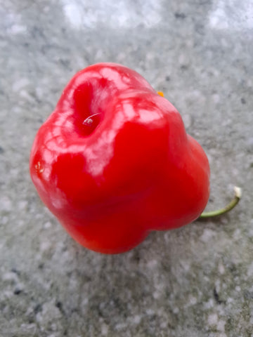 Dickwandiges, sehr würziges, für mich angenehm scharfes, apfelförmiges Chili mit schönen lila Blüten. Es gibt diverse Rezepte für Marmelade aus diesen Früchten. Die Kerne sind schwarz und relativ groß.