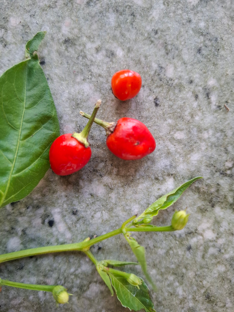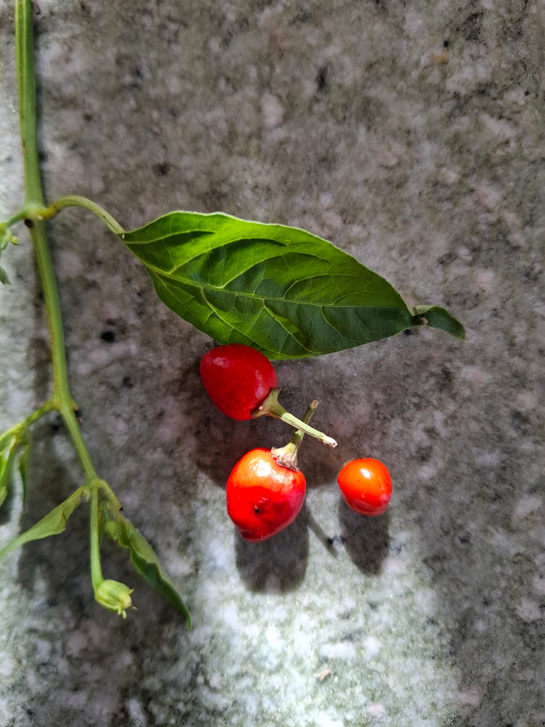 Kleine runde, sehr scharfe Chili, sehr schönes Farbenspiel von Grün über Violette Purpur nach Rot
