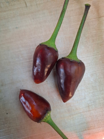 Dunkellilane Blätter, erst purpurlilane, später rote, mittelscharfe, aufrecht stehene kleine Früchte mit super Geschmack
