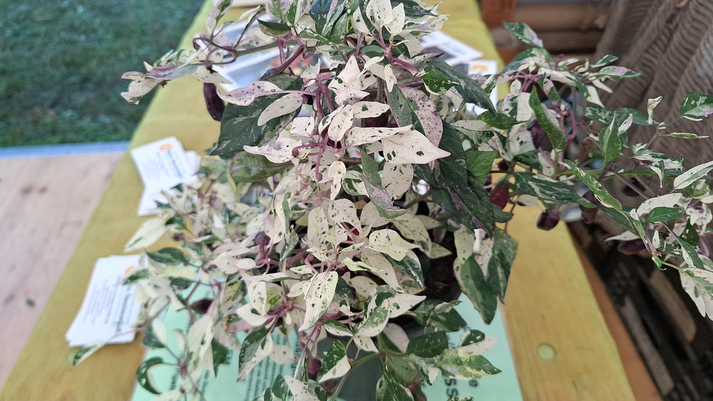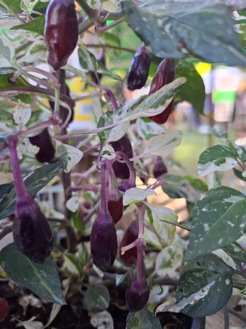 Kleine blockpaprikaförmige scharfe Chili mit Paprikageschmack. Die Sorte zeichnet sich aus durch wunderschönes panaschiertes Laub. Die Früchte sind erst grün, dann schwarz und färben sich bei Vollreife in ein dunkles Rot. Gegessen werden können die Früchte in jedem Stadium