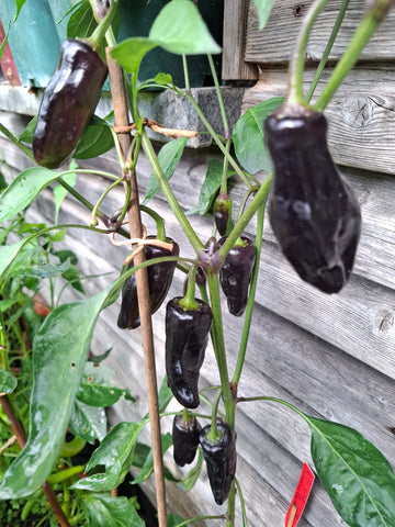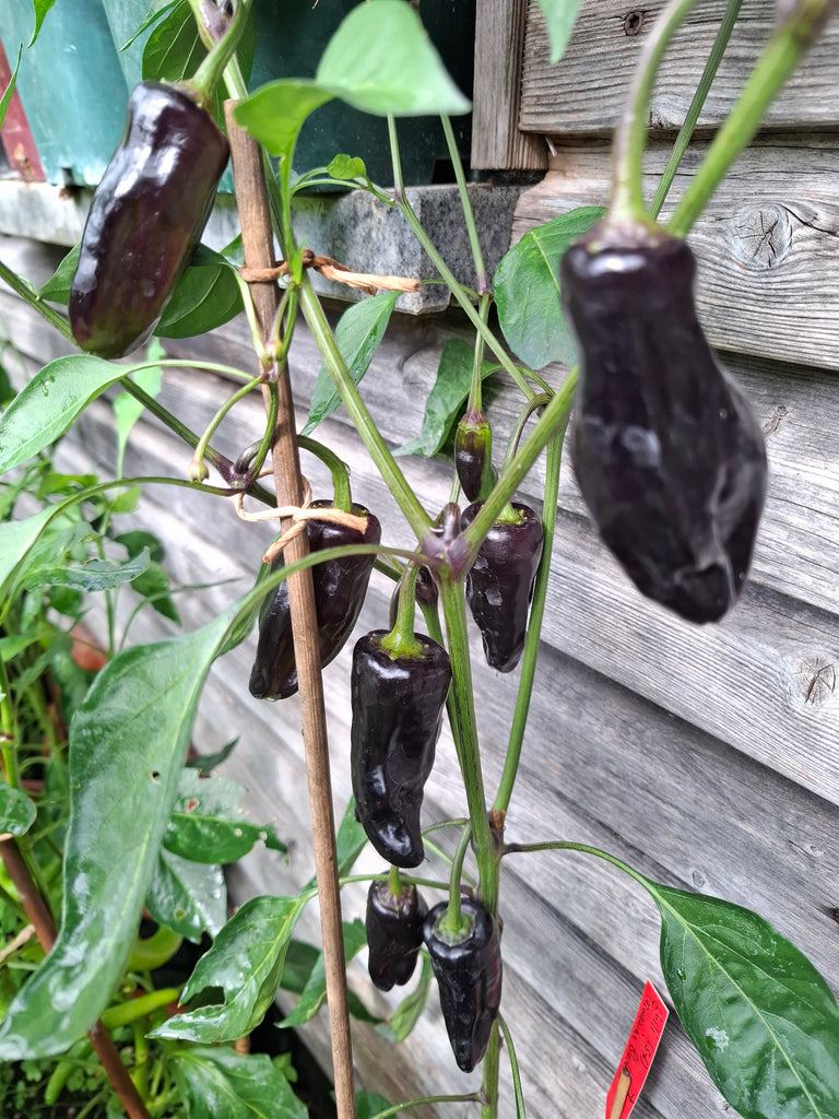 Recht scharfes Annum-Chili, lila-weiße Blüten, erst grüne Früchte, dann schwarz, bei Vollreife wechselt die Farbe in kräftiges Ziegelrot...