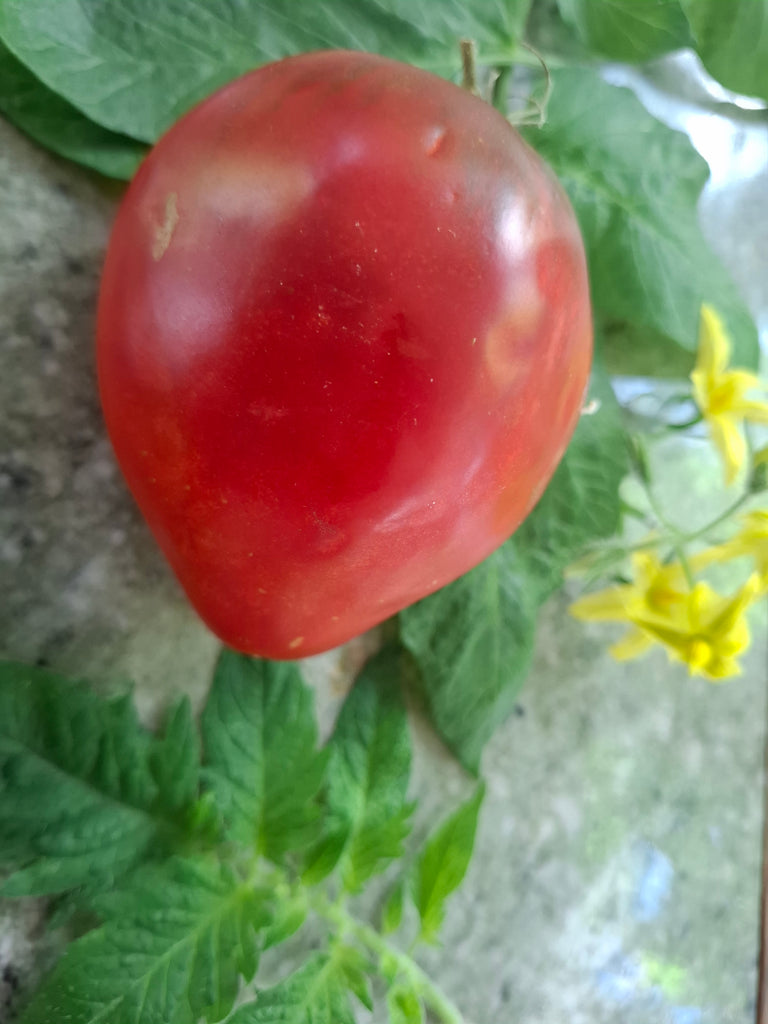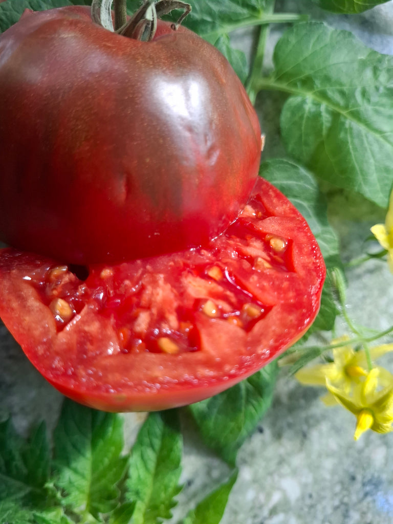 Glattschalige (ungefurchte) Ochsenherztomate in schokobraun mit kräftig aromatischem Geschmack, sehr gut auch für Soßen